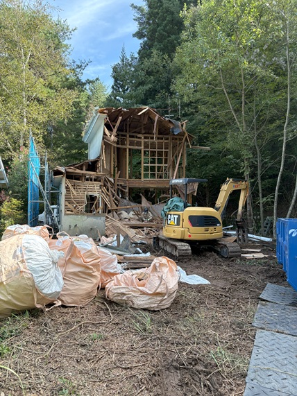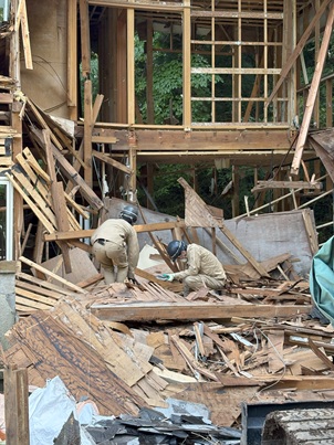 別荘などの建物は林の中で湿気が多いので雨漏りによる腐食が進みやすいです。林の中のため、屋根に枝葉が積り雨どいが詰まります。結果、詰まって逃げ場の無い雨が室内に侵入して雨漏り・腐食・カビになります。まずは、雨どいの清掃することで詰まりをなくし雨漏り原因をなくしましょう。今回の様に別荘ですと、発見が遅れて取返しのつかない状態になります。今回のような雨漏りでなくても、古くなって屋根の強度がなくなりますと解体が安全にできなくなります。屋根の上などで安全に作業のできる状態のうちに解体をすることをお勧めします。危険な状態での解体は、事前に分別ができないので倒してから分別になり時間・費用共に各段に増えてしまいます。